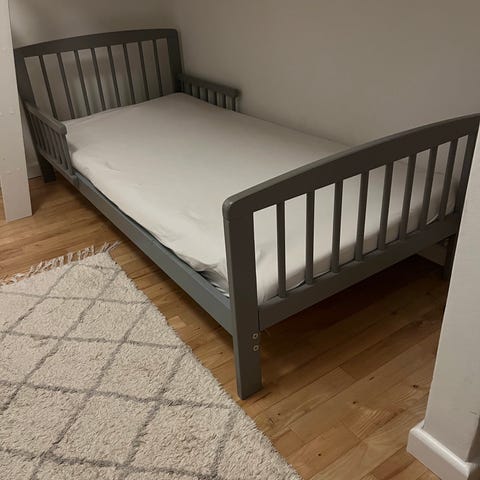 I den ene side kan siden slides op og ned således at barnet kan sikres ikke at falde ud af sengen (som den er indstillet på billederne).