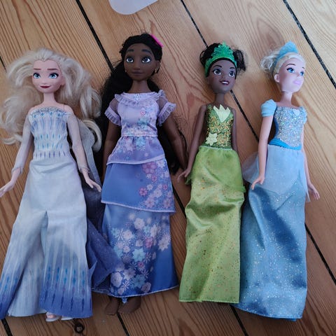 Disney barbie dukker i forskellige designs, herunder havfrue og prinsesse. Dukkerne har tøj i blå og grønne nuancer og er egnet til børn.