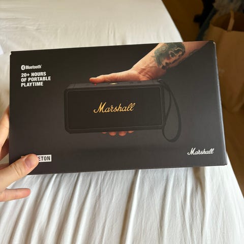 Marshall Højtaler, udstyret med flere drejeknapper til justering af lyd og tilslutningsmuligheder via Bluetooth og kabel. Måler 35*20*20