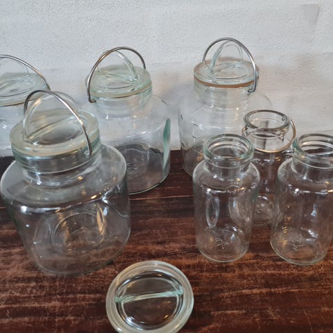 Glassene/lågene har en gummiring samt en metalbøjle for at holde glasset tæt, bortset fra et enkelt glas , der mangler metaldelen.