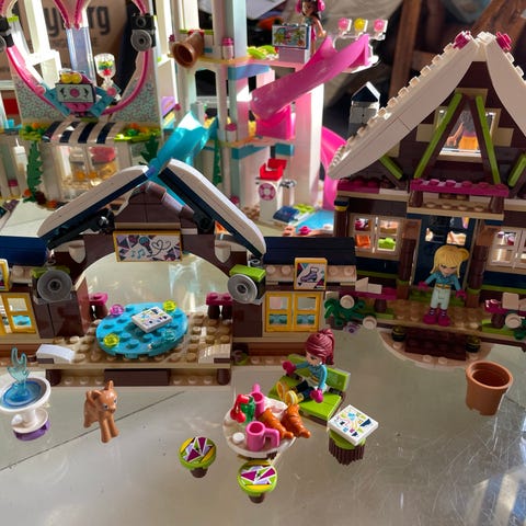 LEGO Friends legetøj med flere bygninger og figurer. Sættet indeholder farverige bygninger i blå, grøn, gul og pink samt tilhørende minifigurer. Egnet til kreativ leg og bygning.