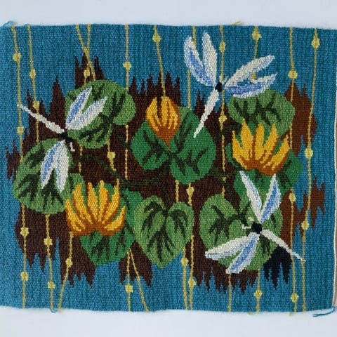 Gobelin/vægtæppe håndvævet i uld af den polske kunstner Eva Januszkowska for Zakopianskie Warsztaty Wzorcowe. Tæppet er fremstillet i Polen og har et unikt mønster, som forestiller blå krokus. Det måler 125 cm i længden og 85 cm i bredden.