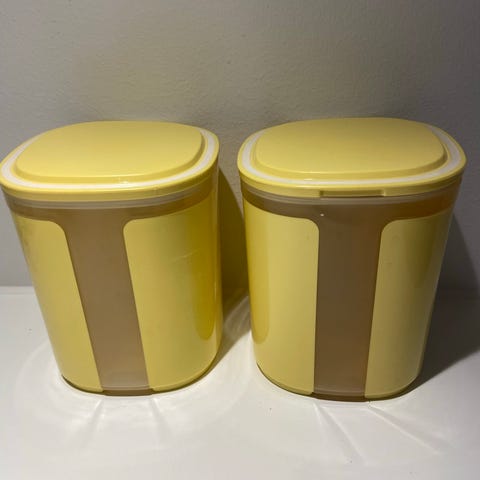 Tupperware opbevaringsbeholdere i forskellige former og størrelser, fremstillet i plast. Beholderne har låg i farver som blå og sort, og kan bruges til opbevaring af madvarer eller andre småting i køkkenet. Prisen er pr. billede