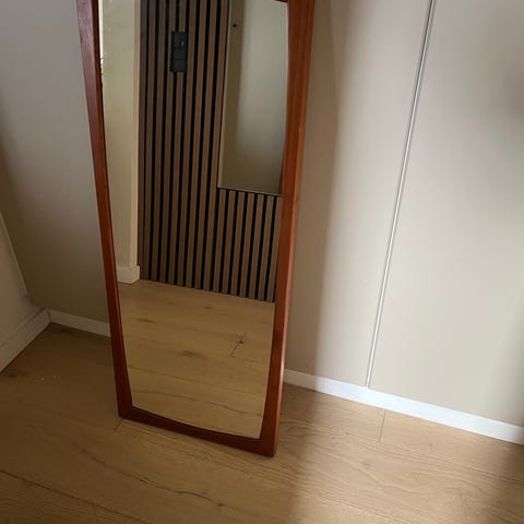 Jysk spejl med træramme. Spejlet er rektangulært og har beslag til ophængning på væg.