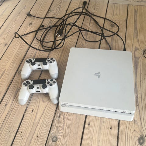 Sony Playstation 4 slim spillekonsol med en hvid controller. Konsollen leveres med nødvendige kabler til tilslutning og opladning. Velegnet til gaming på Playstation 4 platformen.