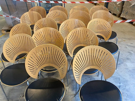 6 stk. Nanna Ditzel Trinidad stole i ahorn, de fremstår med minimale brugsspor og leveres med sort stofhynde. Sort læderhynde kan tilkøbes mod merpris.