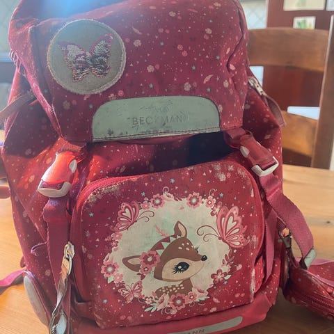 Super Beckmann skoletaskesæt, med to separate tasker, der kan klikkes sammen. Brugte, men i rigtig god stand