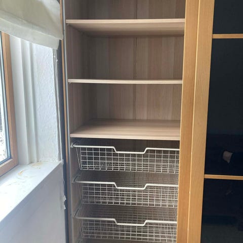 Til begge sider hører en bøjlestang og tre hylder.