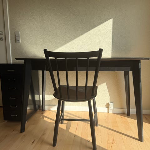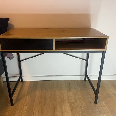 Flot skrivebord i sort træ som fremstår som ny uden meget slid. Under bordpladen er der en skuffe med mulighed for opbevaring. 120cm bredt, 60cm dyb og 75cm højt.