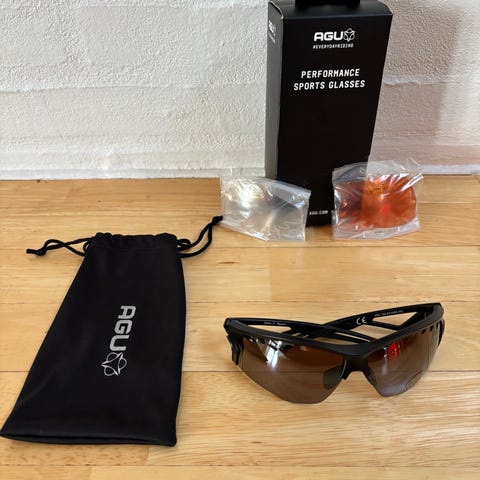 AGU Vigor solbriller med to sæt udskiftelige linser i forskellige farver. Solbrillerne har en sort ramme og leveres med et hårdt etui til opbevaring. Til cykelsport, løb og andre friluftsaktiviteter.