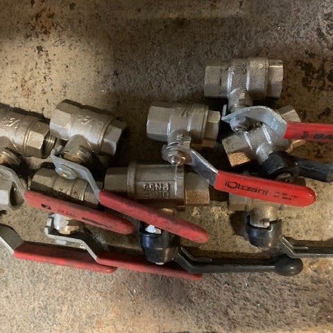 Kugleventil i metal med en størrelse på 3/8 tomme. Ventilen har et sort håndtag
