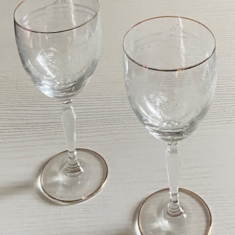2 stk. rigtig flotte gamle krystalglas med guldkant på overkanten og rundt langs foden. Facetslebet glas med flot mønster,