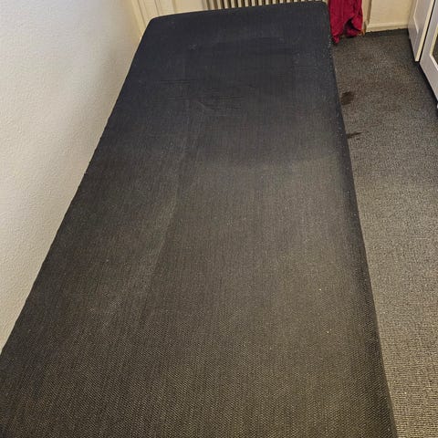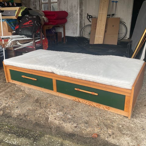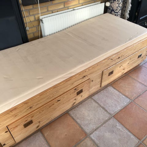 God briks med løse skuffer under. Lamelbund og maddres medfølger ikke.