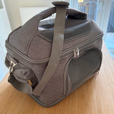 Cykeltaske til kæledyr fra Ollipet. Tasken har netvindue for ventilation. Designet til montering på cykel, egnet til transport af små kæledyr. Læs mere på Cotonshoppen.dk. Lys medfølger ikke men alle slags små alm. cykel eller hunde-lygter kan nemt monteres. Kun brugt 2 gange og i rigtig god stand (ser bare lidt "flad ud på mine fotos, da jeg har haft den liggende foldet et stykke tid)