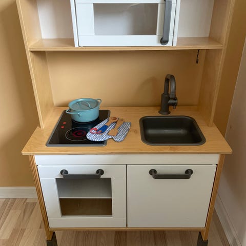 Fint legekøkken fra Ikea med en masse mad og andet tilbehør. Der er bl.a. forskellige oste, mælk, æg, brød, kød, fisk, frugt og grønt. Så er der en brødrister, kopper, tekander, skærebræt og knive.