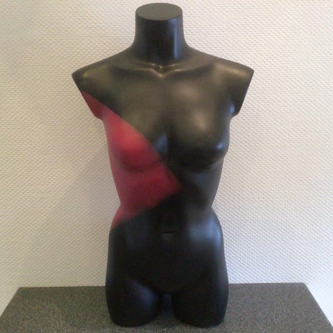 Stofbetrukket mannequinhoved i beige farve i noget naturlignende materiale - måske hør?. Vi har brugt det som dekoration, men er vist egentlig fra butiksindretning.
