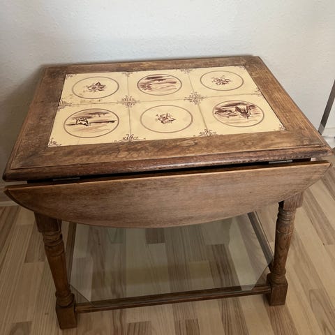 Retro lampebord i massiv lys eg, sæbebehandlet, med lyse kakler. Lille skuffe.