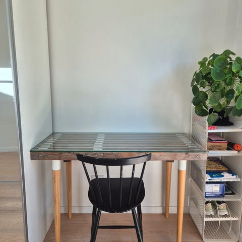 Sortlakeret, robust metal. Hærdet glasplade ligger ovenpå og kan flyttes til siderne så man f.eks. kan have en lille skænk under (eller en anden plade kan bruges). Hult og trukket skjult kabel. Bagerste stang l bunden savet af så den kan tiltes ind af en dør, og kan lægges løst tilbage som på billeder.