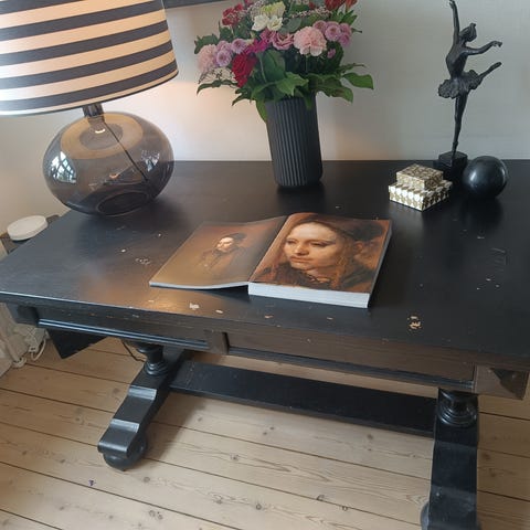 Gammelt smukt bord i massivt træ fra Sverige - har nogle brugsspor (se billeder), men står helt solidt og charmerende. To store skuffer. Bordplade i mørkegrøn linoleum, tror jeg.