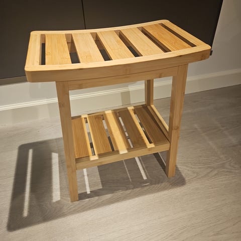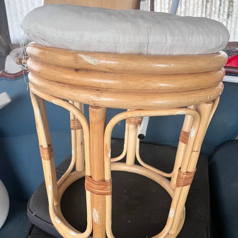 Skamlen har brugsspor i form af ridser, men er stadig fuldt funktionel og ser fin ud – perfekt som ekstra siddeplads, fodskammel eller dekorativ detalje.