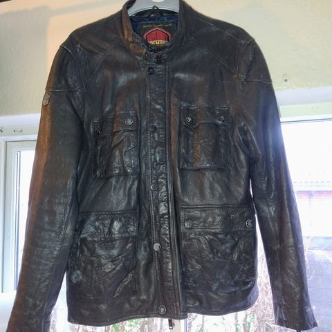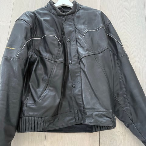 Grand Canyon læderjakke til herre i størrelse 54. Jakken er sort og lavet af læder med polstret indvendig foring. Den har lynlåslommer både indvendigt og udvendigt samt justerbare detaljer ved taljen.