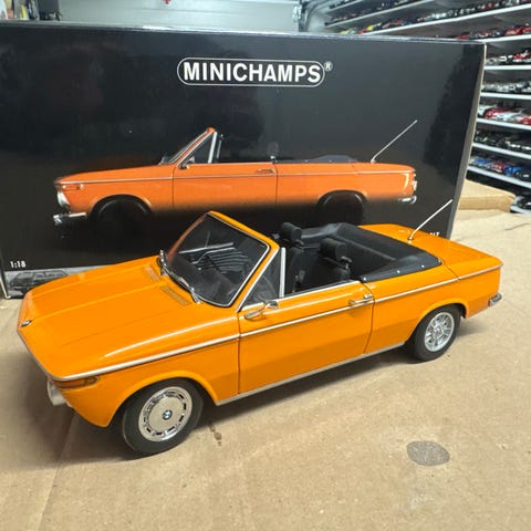 Samling af fem klassiske modelbiler 1/18 i forskellige farver, herunder rød, sort, blå og beige. Modellerne varierer i design og størrelse, og de er lavet af materialer, der efterligner ægte bilers udseende. Velegnet til samlere eller som dekorative genstande.