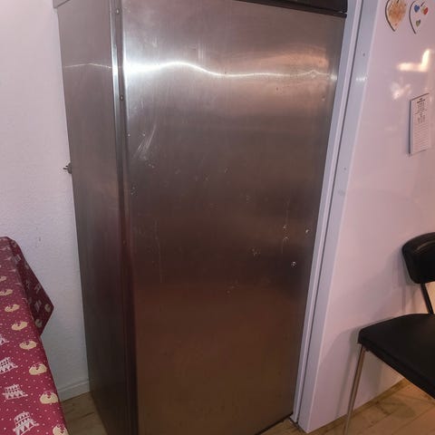 Fryserskab gives væk. Virker fint, med tegn på brug (se særligt sidste billeder af mærker i bunden efter karryplet, pletter på tætningsliste og buler på dør på første billede).