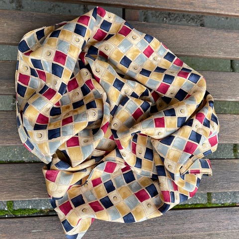 Fint stort tørklæde i silke. Måler ca. 50 x 150 cm. Ingen røg eller dyr. Nyvasket og strøget, klar til brug.
