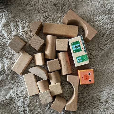 træklodser i forskellige former og farver. Klodserne er lavet af træ og inkluderer farver som rød, blå, grøn og gul. Velegnede til børns leg og udvikling af finmotorik.