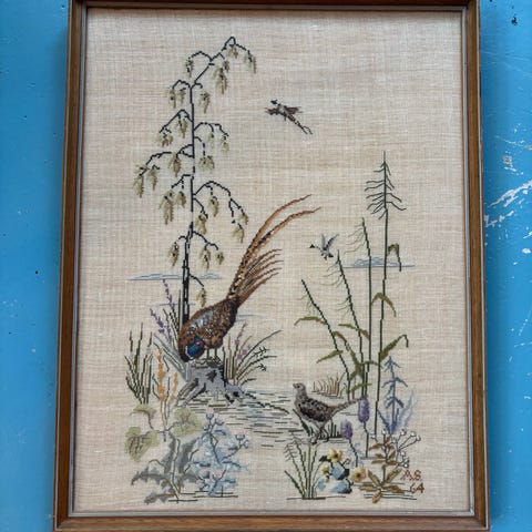 Korstingsbroderi med motiver fra Aarhus. Bl.a. Arne Jacobsens rådhus, og Universitetet.