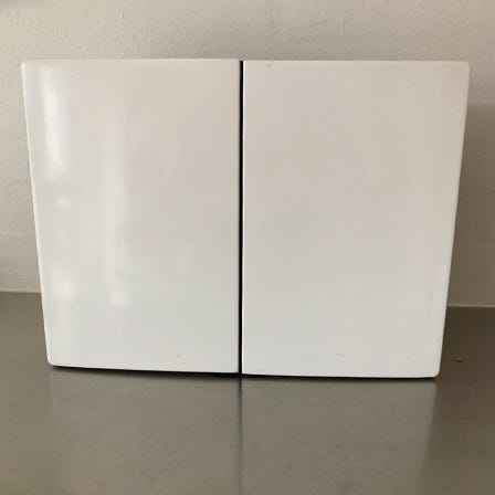 Hvid opbevaringskasse med låg, indvendig ruminddeling og sort indre. Kassen er lavet af plast og har flere separate rum til opbevaring af mindre genstande. Kan anvendes til organisering og opbevaring i hjemmet eller på badeværelset.