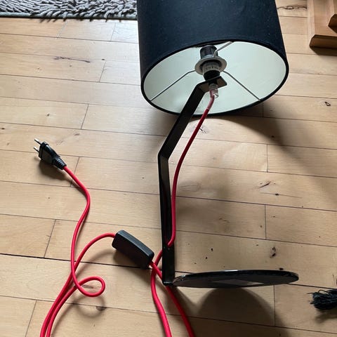 Fin, stabil bordlampe med flex lampeskærm. Stål/sølvfarvet med sort ledning.