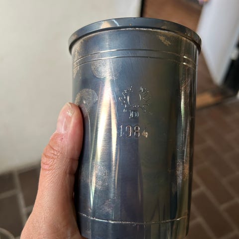 Fad eller askebæger fra Københavns Politiforening fremstillet af Royal Copenhagen. Dekoreret med logo og guldkant. Formentlig fra midten af 1960-erne. Har aldrig været i almindelig handel, men er udelukkende givet som anerkendelsesgave, jubilæum og tilsvarende, af politiforeningen.