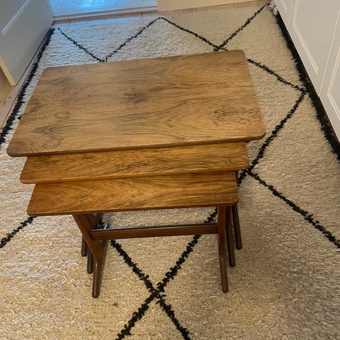 Bemærk mærker/ringe, primært på miderste bord. Kunne bruge lidt håndslib og en teaktræsolie.