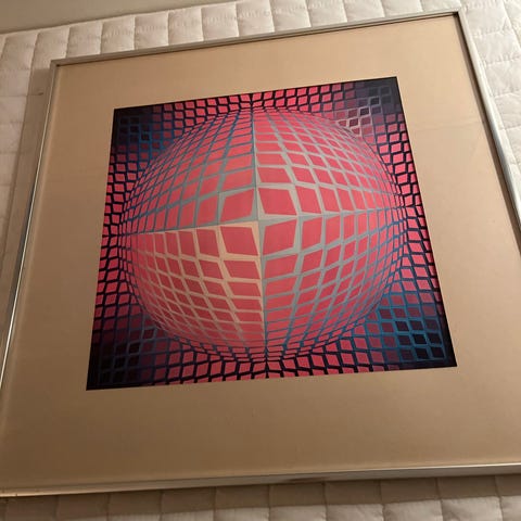 Optisk illusion kunstværk med geometrisk mønster i sort, grå og beige nuancer. Kvadratisk format med ramme. Abstrakt design med tredimensionel effekt, der skaber visuel dybde og bevægelse.