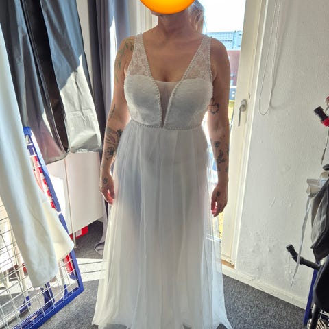 Kjolen er stk XL, men på tidspunktet var jeg reelt en stk. M/L. Jeg er en 169 høj og havde ca. 3 cm hæle/sandaler på til. Kjolen er lagt op i bunden efter den højde og stropperne lagt lidt op, så jeg ikke behøvede BH under.