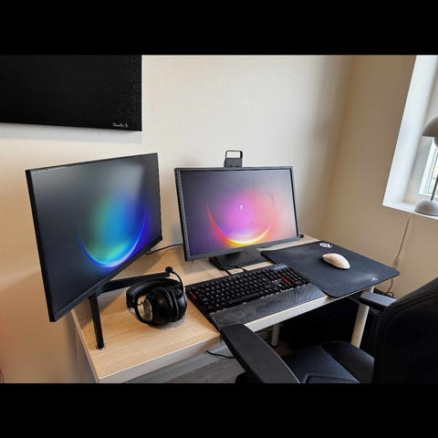 Dette starter setup indeholder computer, 2 skærme, tastatur, mus, musemåtte headset, mikrofon, gamer-bord, gamer-stol, lidt RGB-lir til værelset OG det bedste af det hele, alt virker!