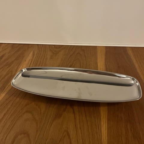 Smukt og markant serveringsfad fra Alessi i blankpoleret rustfrit stål. Den brede kant er dekoreret med de karakteristiske udstansede figurer, som giver fadet sit legende og genkendelige Alessi-udtryk.