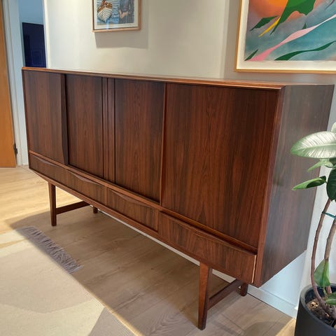 Flot og stilren skænk i palisander finer med et klassisk. Skænken har en glaslåge i den ene side, åbne hylder i den anden samt skuffe og lukkede rum i midten, hvilket giver rigtig gode opbevaringsmuligheder. Velegnet til stue, spisestue eller kontor. Skænken er opdelt i 4 separate moduler, hvilket gør den nem at transportere.