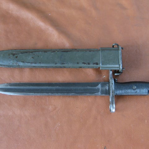 Dansk m/1950 Garand bajonet i sort skede fra livgarden. Klingen er stemplet "krone" FKF 1955. Både bajonet og skede er i god men brugt stand og leveres med den fine webbing gehæng. Et forholdsvis sjældent sæt.