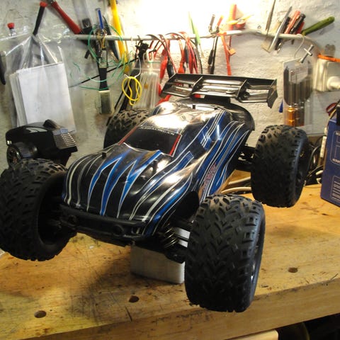 Bilen har fået en anden karosse (blå/ gul) (gls mulig). Bilen har ikke kørt meget, jeg har haft den fra ny !!. (god bil) Den er klar til Race, du kan køre når du pakker den ud, det hele følger med + (Brugt batteri).