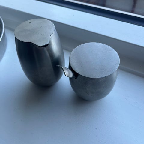 Columbia sukker & fløde sæt krom. Sættet inkluderer en kande med låg og en sukkerskål med låg og ske. Materialet er rustfrit stål, hvilket gør dem holdbare og nemme at rengøre. Giv et bud!