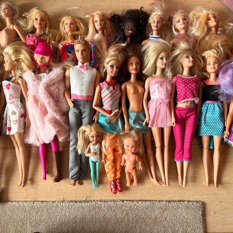 Almindelige Barbie dukker, Ariel, to havfruer, en med lys og en der kan skifte farve, gravid Barbie osv. sko og tøj. Barbie dreamhouse, Ariel sminkebord, tandlægesæt shellys bil med campingvogn, køkken, indkøb, frisør og ambulance samt dykkerudstyr. Der er to heste: den ene har dog mistet sine vinger.