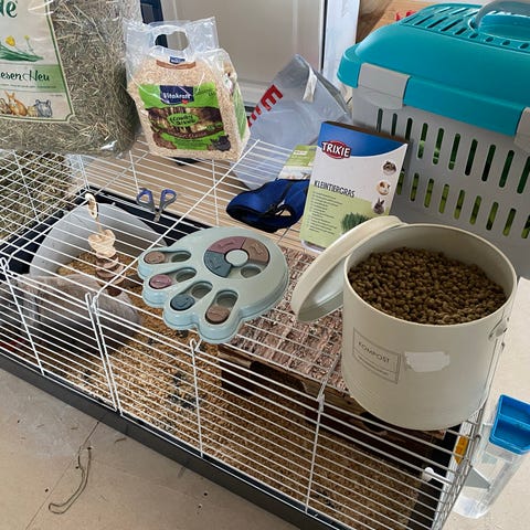 Pink kaninbur med to etager for små kæledyr. Buret har en rampe mellem etagerne og metalgitter i toppen. Bunden har en beskyttende overflade, der viser tegn på brug. Der følger også rør med fra øverste etage ned til bunden, trænger til en vask og noget ny spray maling