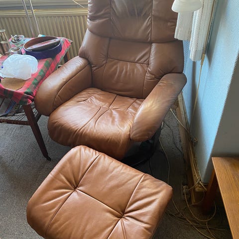 Bend lænestol med skammel og rød læderpolstring og ubehandlet træstel i eg.