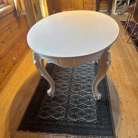 Smukt patineret bord med dueblå bordplade, med et ben der skal have lidt kærlighed (se foto).