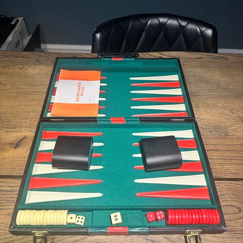 Backgammon spil med bræt og opbevaringskasse i brunt kunstlæder.