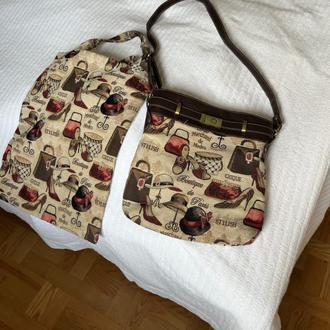 Der er blomster i bunden som er aftagelige. Den ene blomst er blevet lidt ridset, men har ingen betydning for funktionen af tasken.