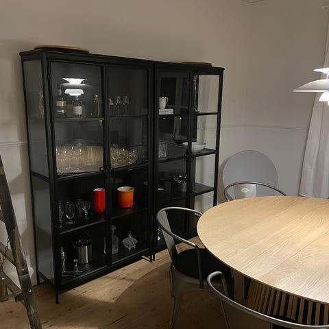 Vitrineskab i sortmalet metal. 3 stk glashylder. Står som ny