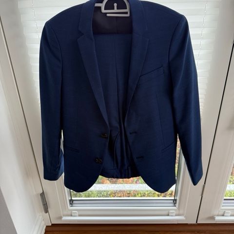 Jack & Jones jakkesæt i blå farve til dreng, størrelse 176 Fremstillet af polyester, wool , elastan Sættet sælges samlet Butterfly medfølger ikke Sender gerne dog ikke som Fiks og færdig